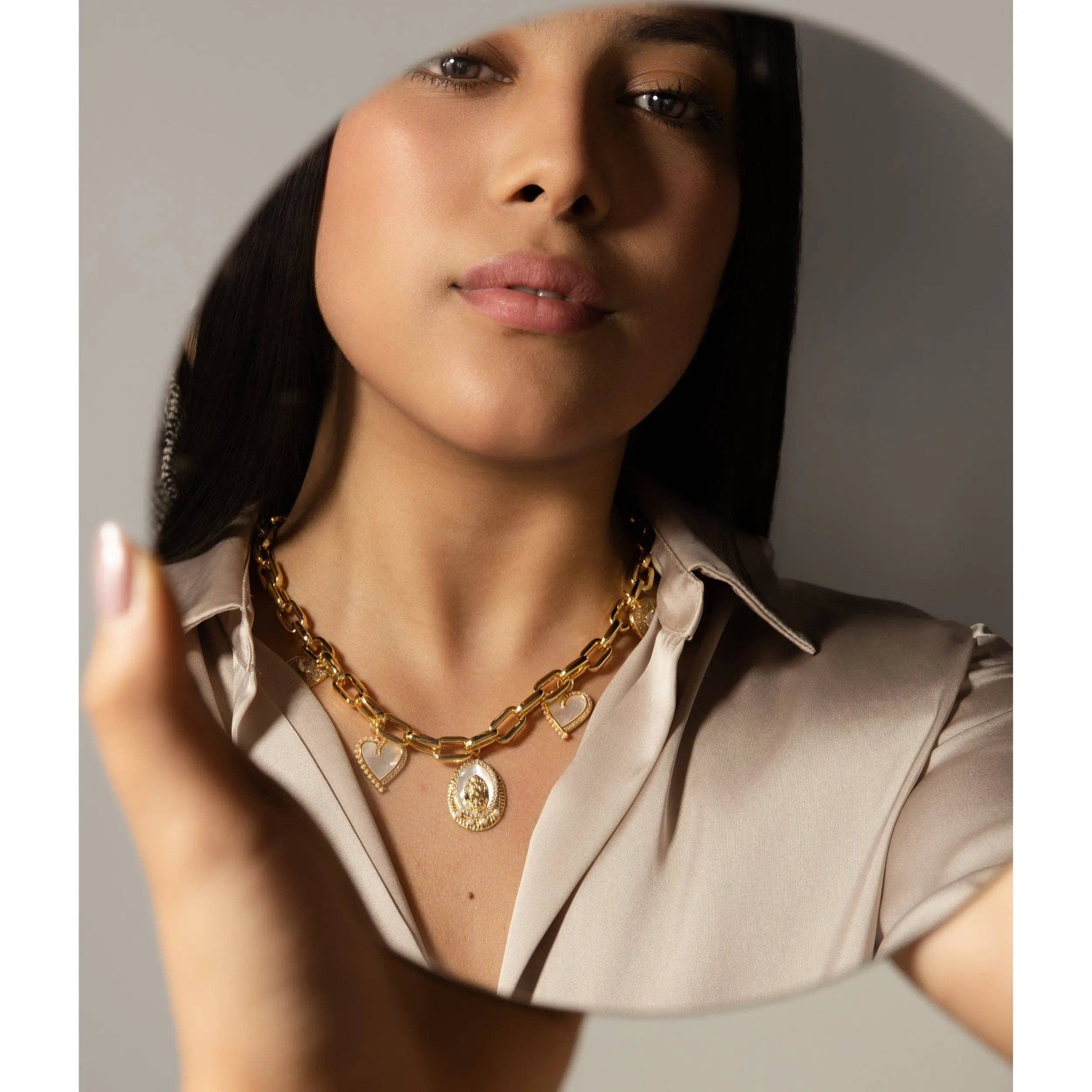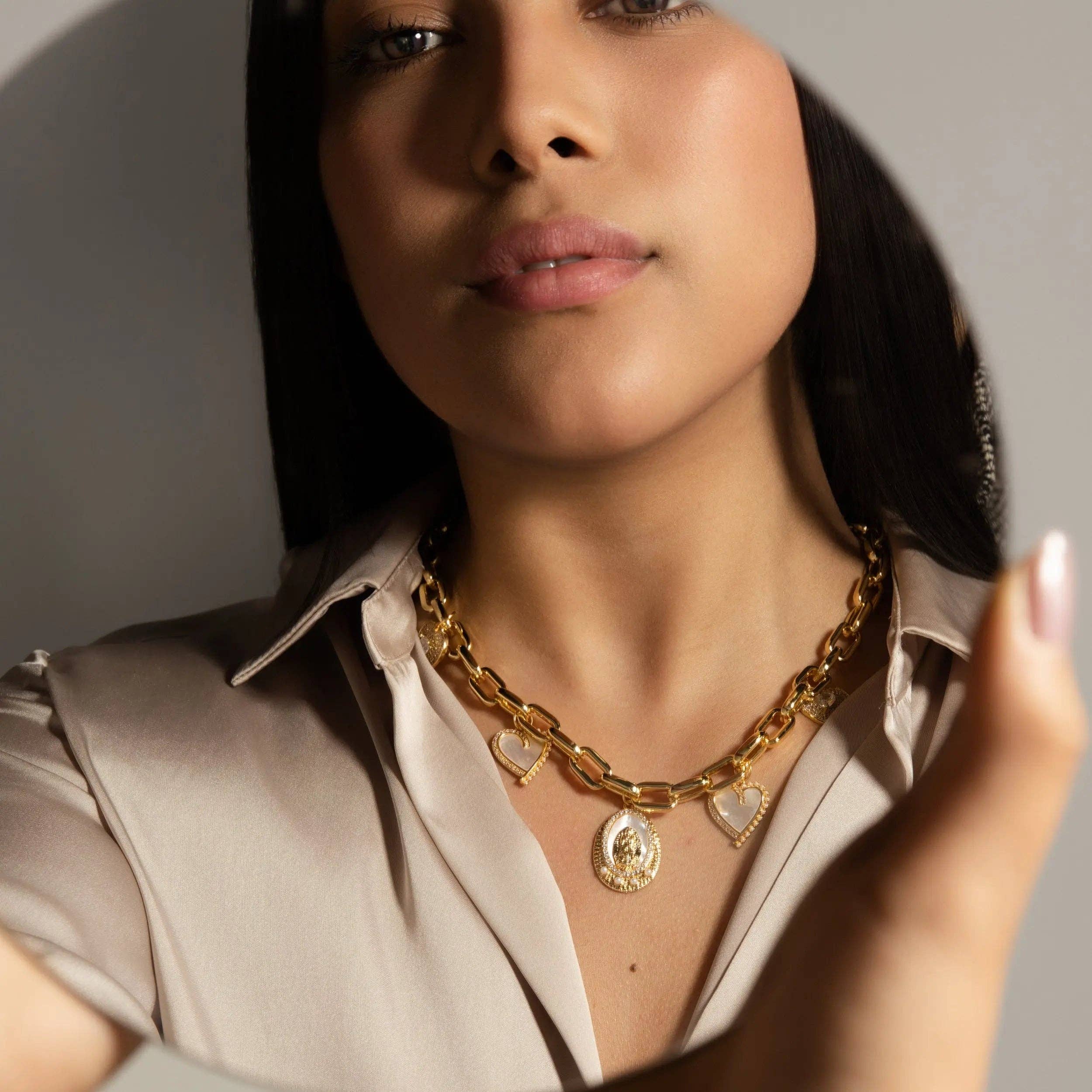 Beautiful Catholic Jewelry: Virgin Mary Hearts Charms Necklace Our Exquisite Catholic Jewelry collection includes this stunning Virgin Mary Hearts Charms Necklace, designed with meticulous attention to detail. It makes an ideal Catholic gift for your loved ones, whether for special religious occasions or simply to express your faith. The Virgin Mary pendant is elegantly crafted to provide spiritual inspiration, and it complements any outfit beautifully. Don't miss out on gifting your dear ones this meaningful piece of jewelry. This mesmerizing Virgin Mary Hearts Charms Necklace not only carries spiritual significance but also adds a touch of elegance to any ensemble.