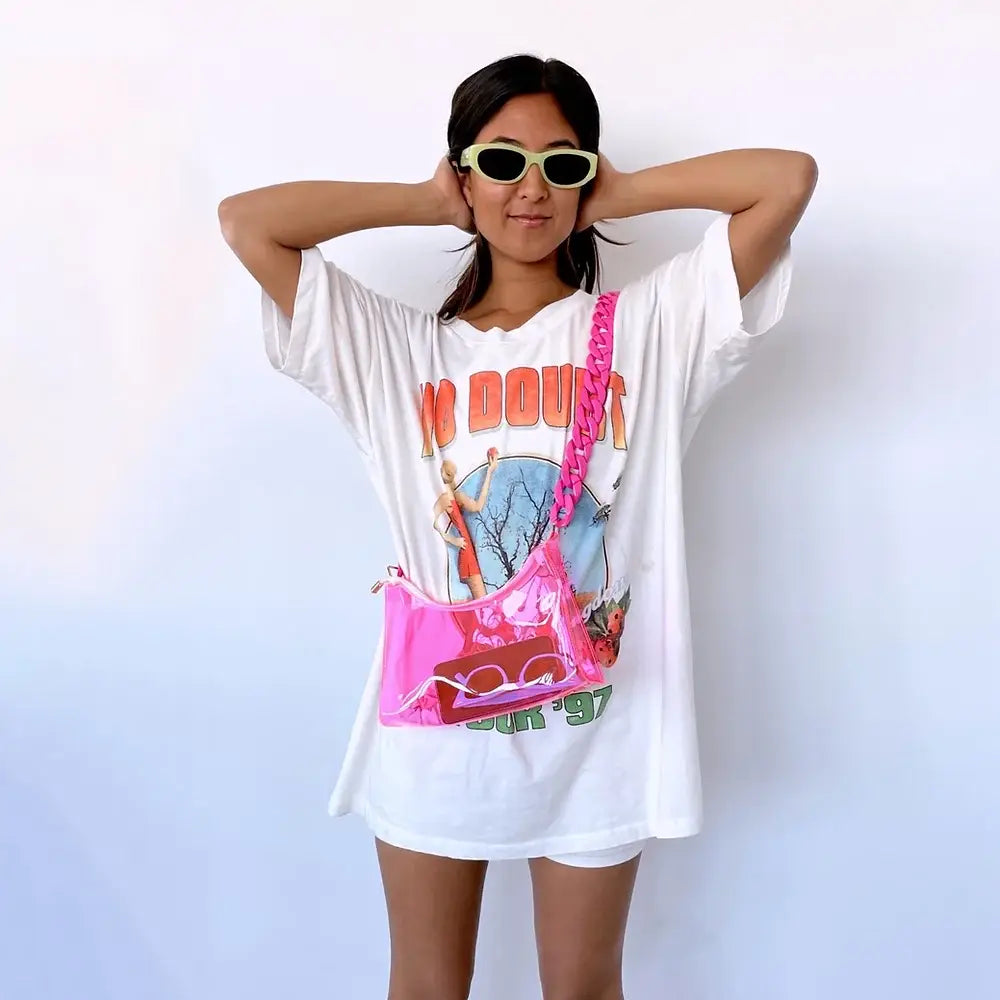 Stadium-approved neon pink show-stopper crossbody bag. You need it! Approved for stadiums, festivals, concerts and sporting events. Wear the bag crossbody or as a shoulder bag. Unique yet practical. Daytrip dares you to color outside the lines and express yourself through bold style. Designed in Boulder, Colorado. Clear bags mean faster lines & safety for all. Let's dance! • PVC Stadium Approved • Zip to close • Bag Dimensions: 10 x 6 x 2.5 in. • Chain: 36 in.