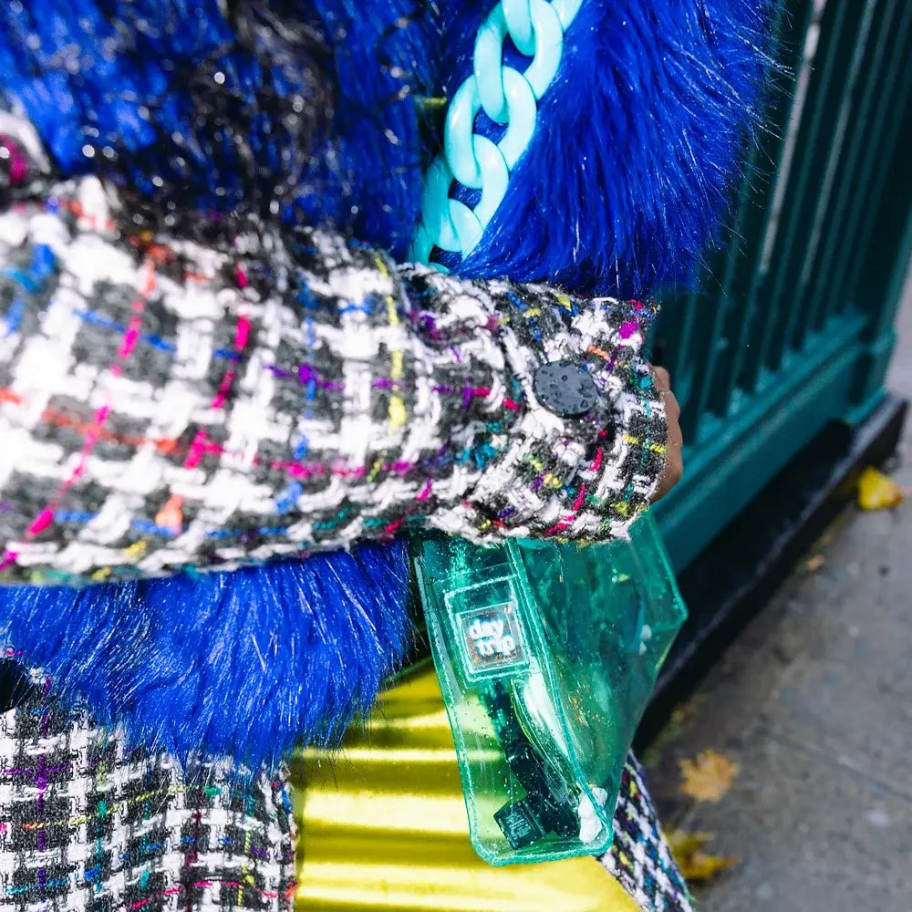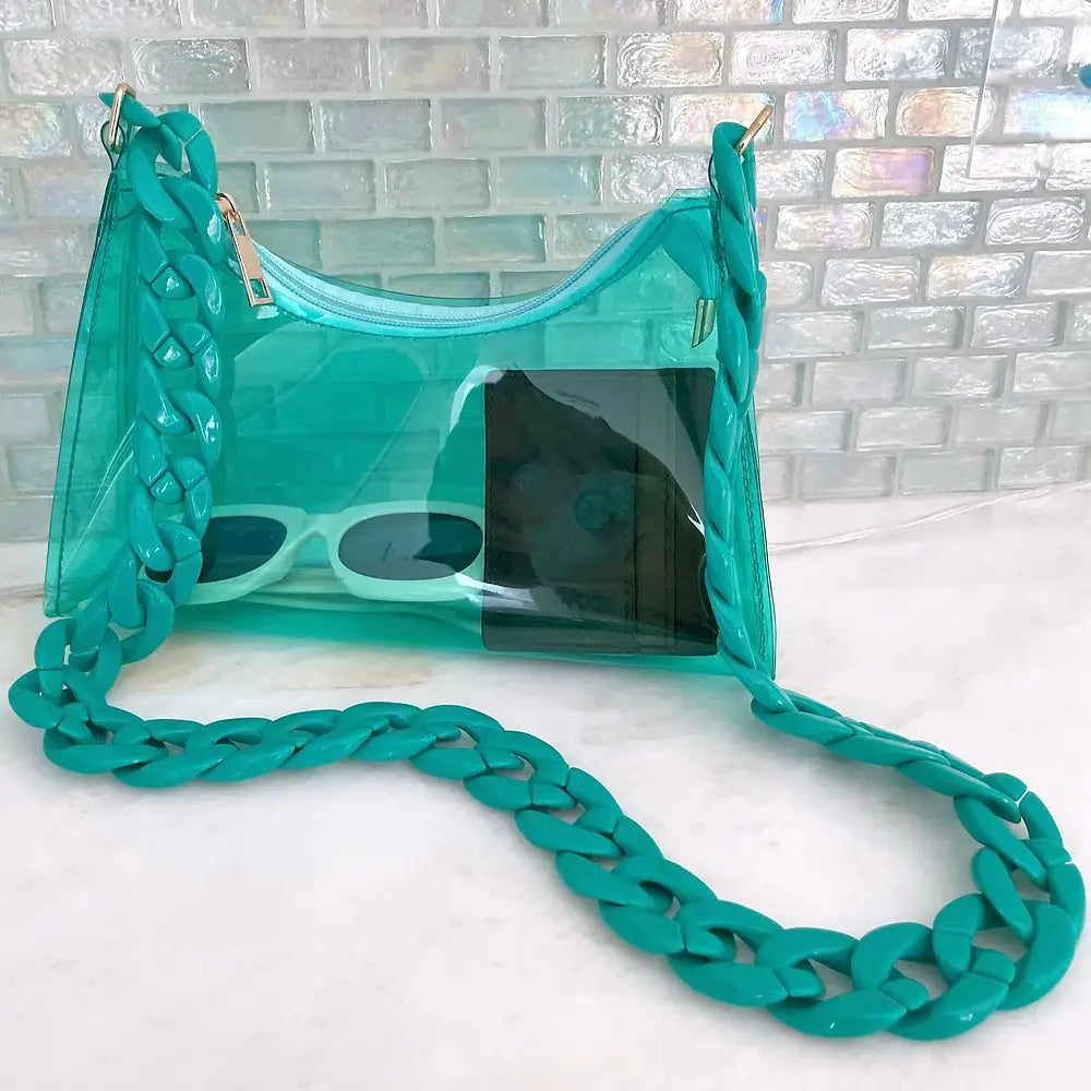 Stadium-approved clear teal crossbody bag! Approved for stadiums, festivals, concerts and sporting events. Wear the bag crossbody or as a shoulder bag. Unique yet practical. Daytrip dares you to color outside the lines and express yourself through bold style. Designed in Boulder, Colorado. Clear bags mean faster lines & safety for all. Let's dance! • PVC Stadium Approved • Zip to close • Bag Dimensions: 9.5 x 5 x 2.5 in. • Chain: 38 in.  GIVE BACK MISSION: Daytrip donates a portion of profits back to an community-focused anti gun violence charity, Clear bags at shows = safety for all.
