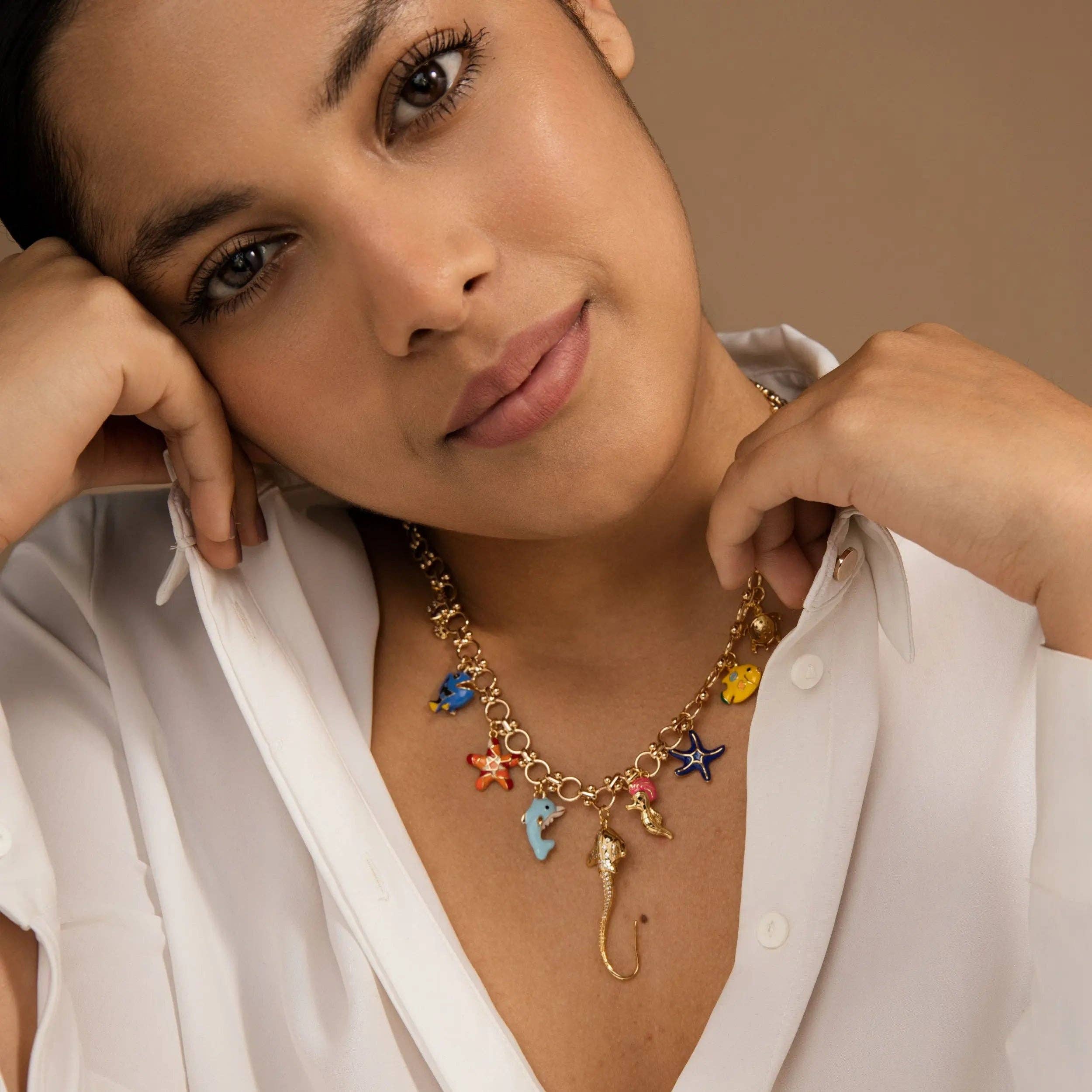 The pendants are gold-plated, maintaining an elegant coherence with the chain, and are adorned with enamel details that enhance their colors and shapes. Polish tones range from deep blues and sea greens to hints of iridescent white and soft oranges, evoking the vibrant panorama of life under the sea.