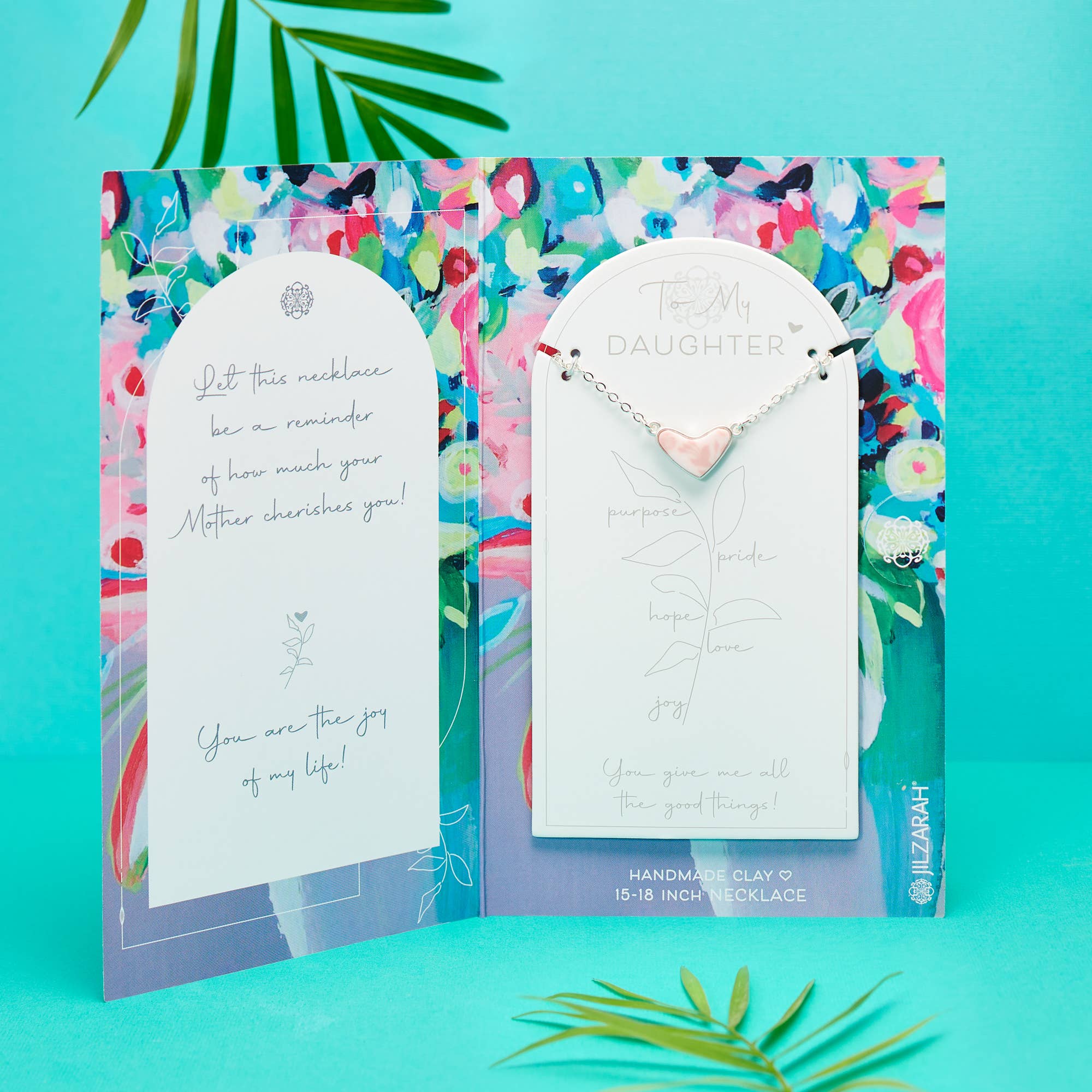 The perfect gift to let your Daughter know how special she is to you! This double-sided necklace comes ready to gift and is enclosed in a card with original JILZARAH artwork. Additional details: - Handcrafted polymer clay inlays nestled in a double-sided heart shaped bezel frame - Matte silver-colored plating features e-coating to help guard against wear and tarnishing - Chain style w/ Lobster Closure - Measures 14” w/ 3” extender - Lead-free, nickel-free, and cadmium-free