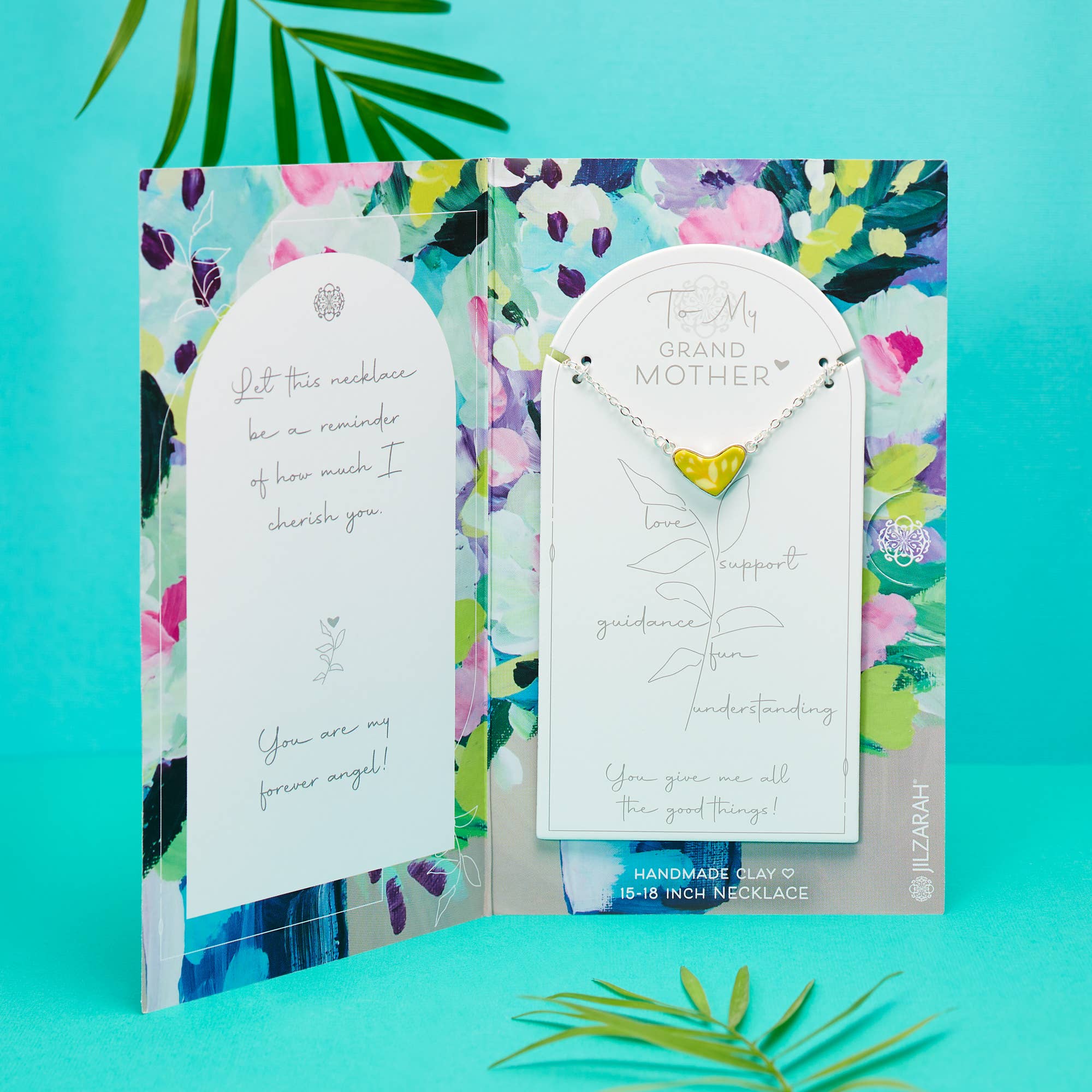 The perfect gift to let your Grandmother know how special she is to you! This double-sided necklace comes ready to gift and is enclosed in a card with original JILZARAH artwork. Additional details: - Handcrafted polymer clay inlays nestled in a double-sided heart shaped bezel frame - Matte silver-colored plating features e-coating to help guard against wear and tarnishing - Chain style w/ Lobster Closure - Measures 14” w/ 3” extender - Lead-free, nickel-free, and cadmium-free