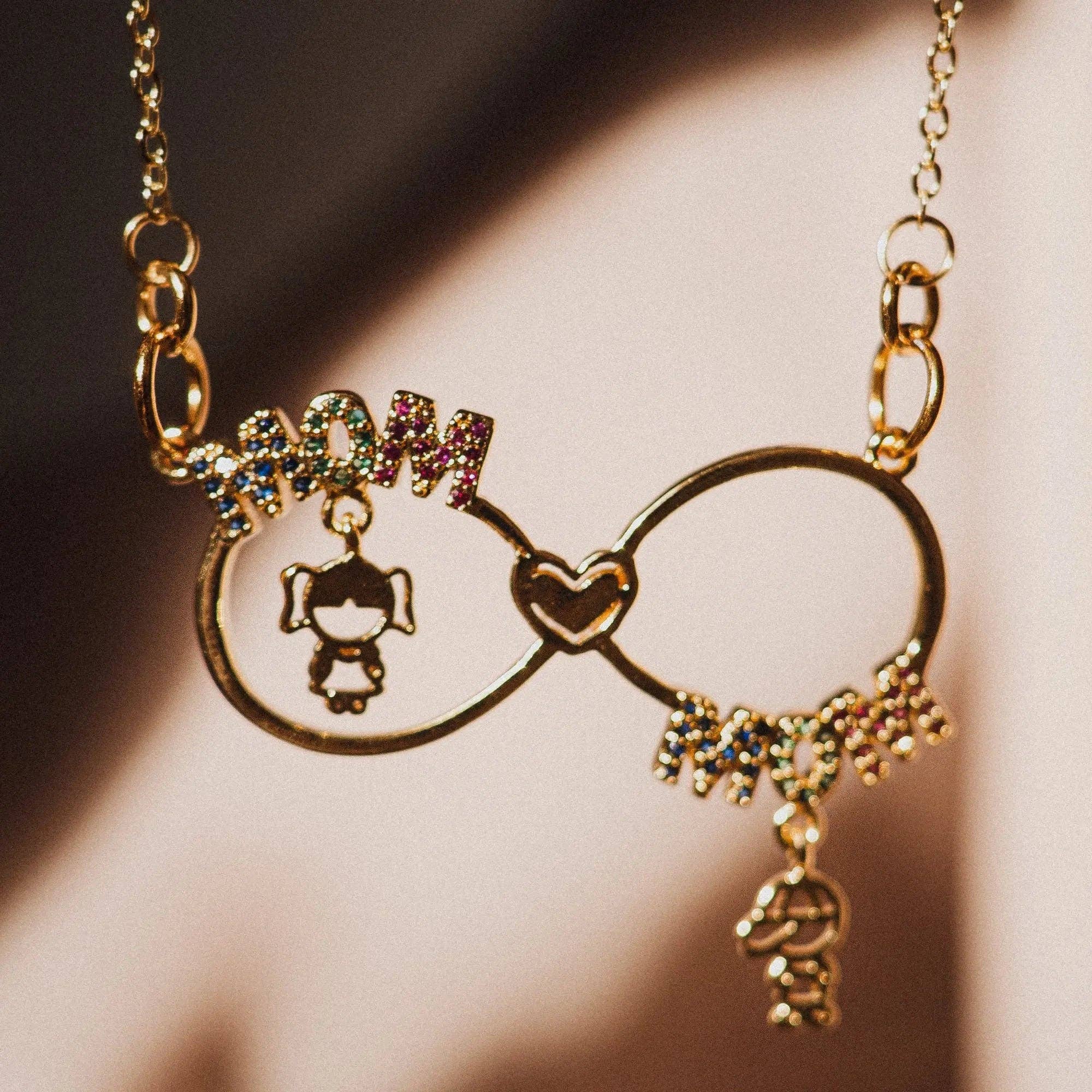 Minimalist Necklace - A Perfect Mother's Day Gift This is a beautiful necklace designed as a gift for Mother's Day. It is gold-plated, giving it an elegant and sophisticated look. It is covered with pave-set cubic zirconia, adding extra sparkle to the necklace. This necklace is a beautiful and meaningful gift for any mother, as it represents her important role in her children's lives. The pendant is made of a strong and durable metal. The figure is sculpted with great detail and has a polished and shiny finish that gives it an elegant appearance. The figure of the mother and her young children is a beautiful and meaningful way to honor mothers on their special day.