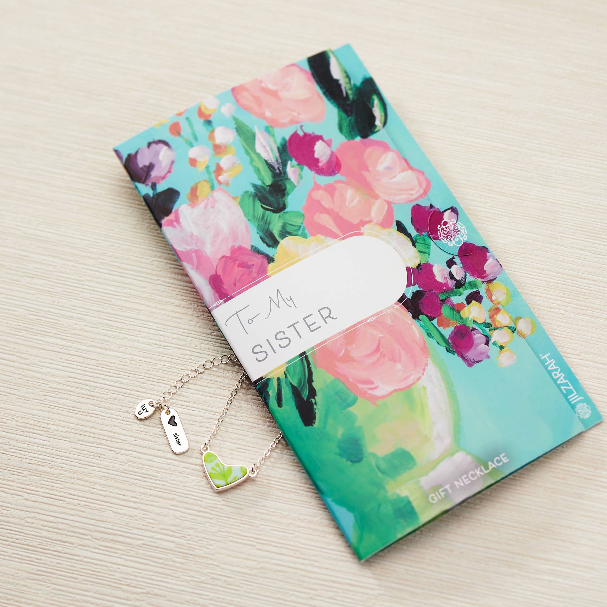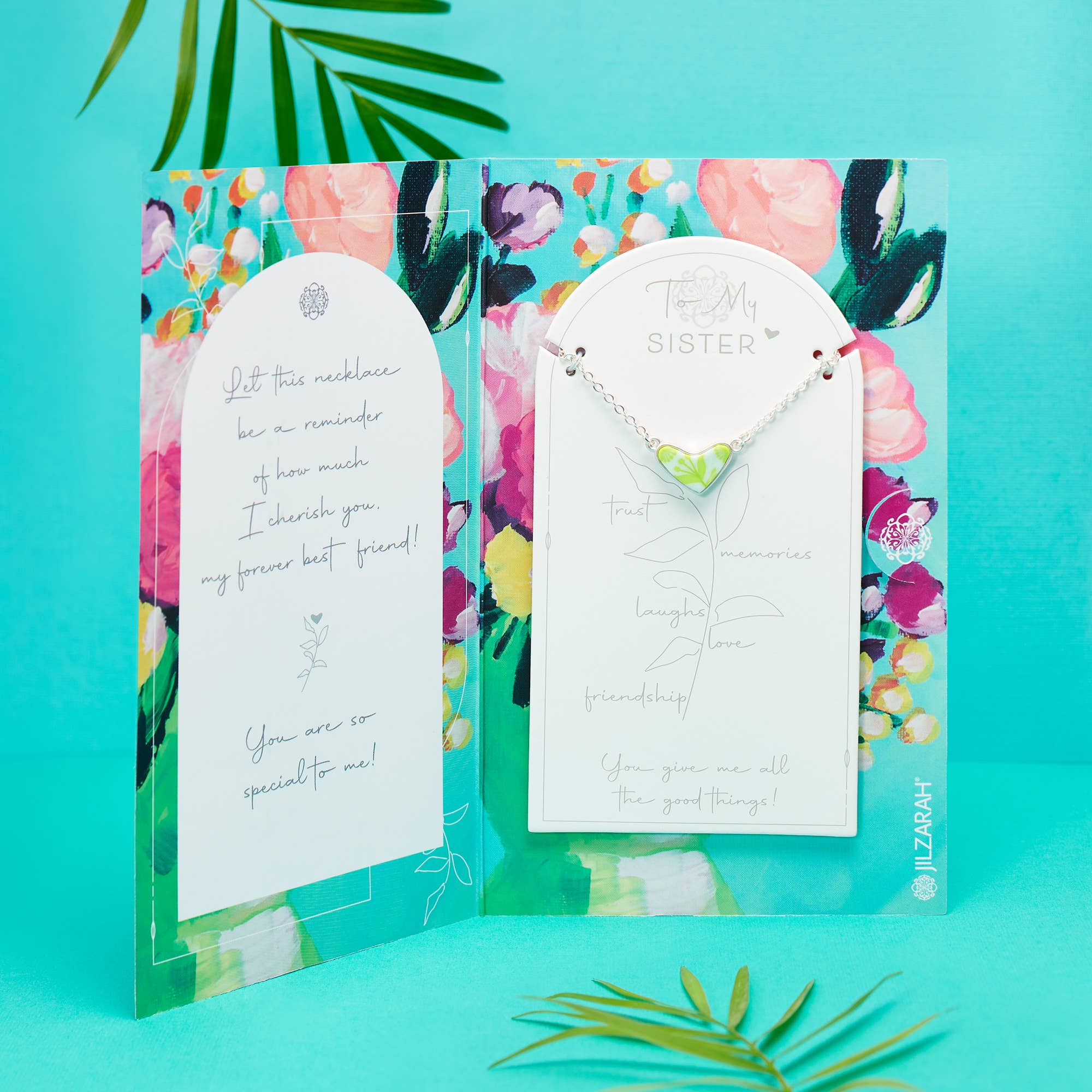 The perfect gift to let your sister know how special she is to you! This double-sided necklace comes ready to gift and is enclosed in a card with original JILZARAH artwork. Additional details: - Handcrafted polymer clay inlays nestled in a double-sided heart shaped bezel frame - Matte silver-colored plating features e-coating to help guard against wear and tarnishing - Chain style w/ Lobster Closure - Measures 14” w/ 3” extender - Lead-free, nickel-free, and cadmium-free