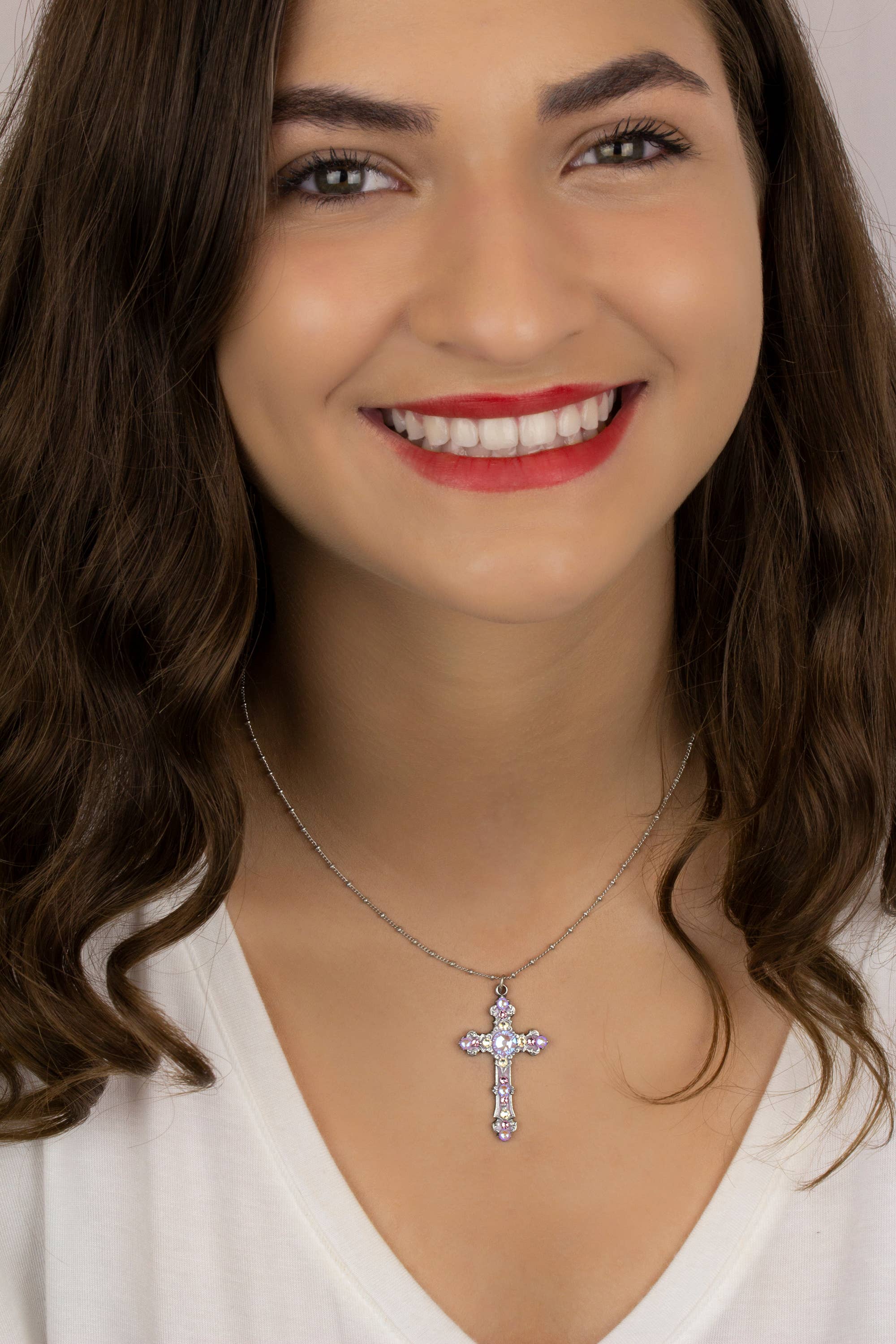Sweet pink glows in this vintage inspired cross pendant. Featuring hand enameling with crystal accents in soft shades, this necklace is a lovely addition to your favorite look. Made in the USA with lead/nickel free antiqued silver-plated brass findings and chain. Lobster claw closure. Crystal Colors: iridescent lavender pink, light amethyst, shimmering crystal Enamel Color: pale pink Measures Approximately: Pendant 1 5/8" L x 1" W; Chain 16-18" adjustable Easter, Mother’s Day, jewelry, jeweler, handmade, fashion, gift, accessory, fashion accessory, handmade jewelry, handmade gift, jewelry gift, designer jewelry, fashion jewelry, vintage inspired, filigree, faith, confirmation gift, communion gift, bridesmaid, religious, crosses, Christian
