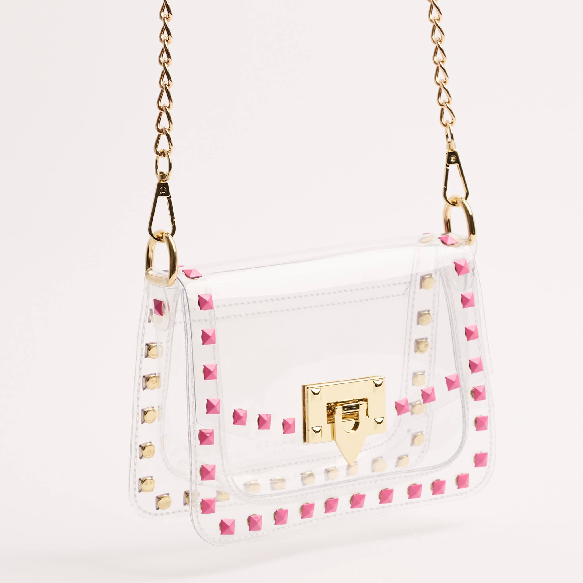 Score with the biggest winner in our clear handbag playbook - The Jackie! The Jackie changed the handbag game by proving that handbags could be functional and chic. This style includes bright pink square metal studs and a gold chain. The Jackie is NCAA and NFL-compliant and the ideal size to hold your wallet, phone, keys, lip gloss, and a few other small items. DETAILS: • W 8" x H 6" x D 3" • Durable PVC • Pink Square Stud Accent • Gold-Plated Hardware and Chain The Jackie is available in lots of colors! Check out the rest of our color selection in our shop. Custom colors are available upon request - message us for details!